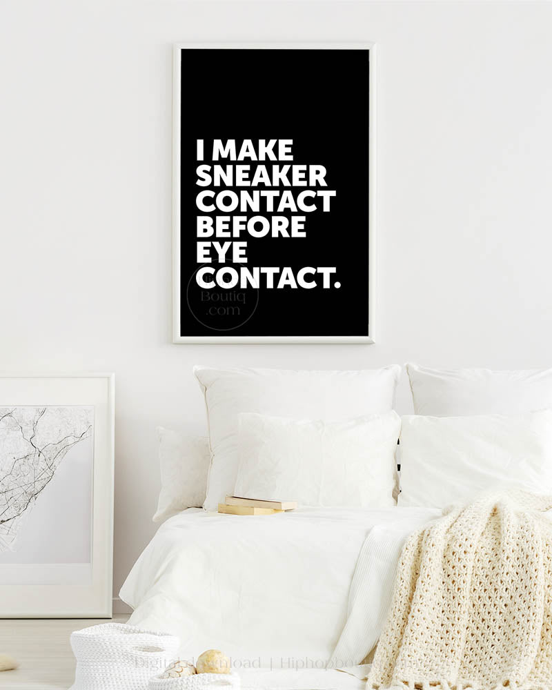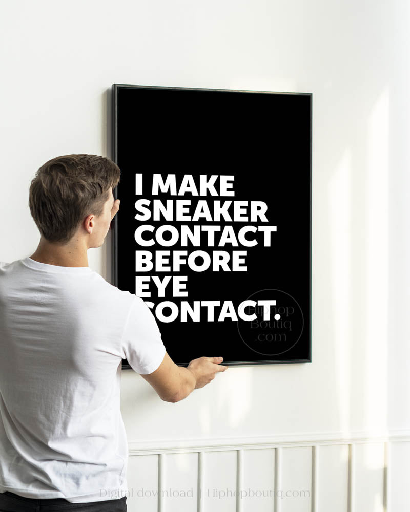 "I make sneaker contact before eye contact." This fun sneakerhead poster is a must-have for all sneaker lovers! Update the look of your sneaker inspired home or give as a gift to a fellow sneaker head. This printable quote will help fill up that blank spot in your wall. Perfect wall art for any room!
