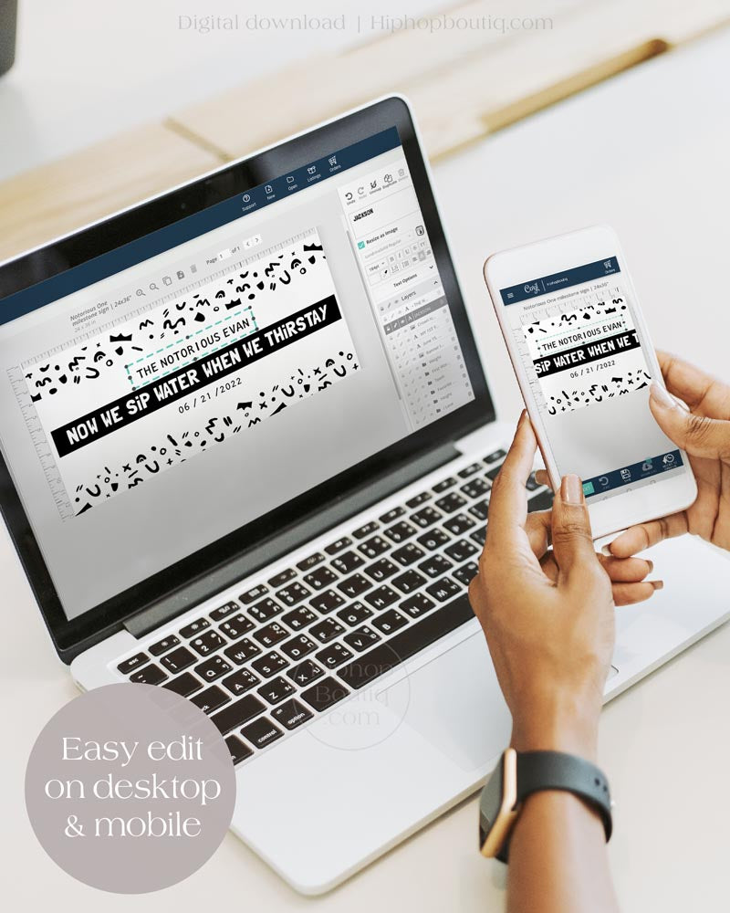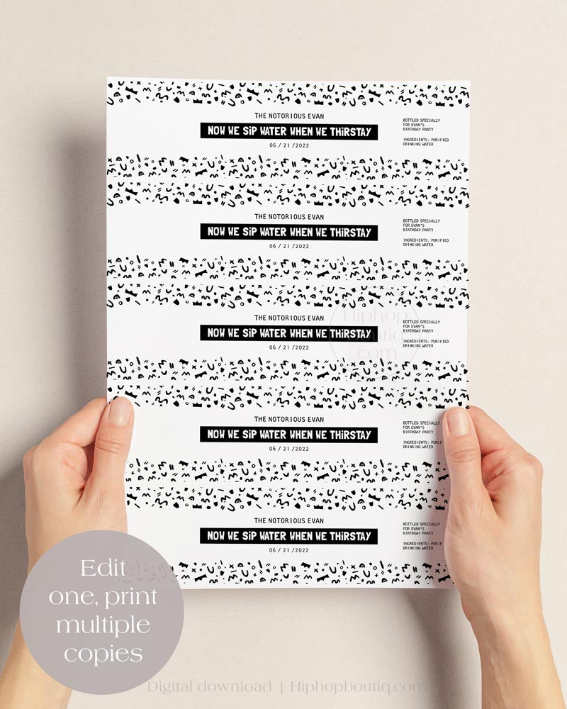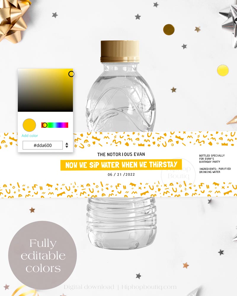 Elevate your little one’s birthday bash with our Notorious One water bottle labels! Infuse your party with hip hop vibes and turn your bottles into personalized party favors with this editable template. Easily customize the name, colors and text for a truly unique touch. Designed for DIY enthusiasts, this printable party supply is available for instant download and printing. Perfect for 'The Big One' and 'Two Legit to Quit' birthdays, baby showers, and beyond. Make your event truly unforgettable with these 90s rap-inspired bottle labels — an essential addition to your 90s gangsta party decorations!