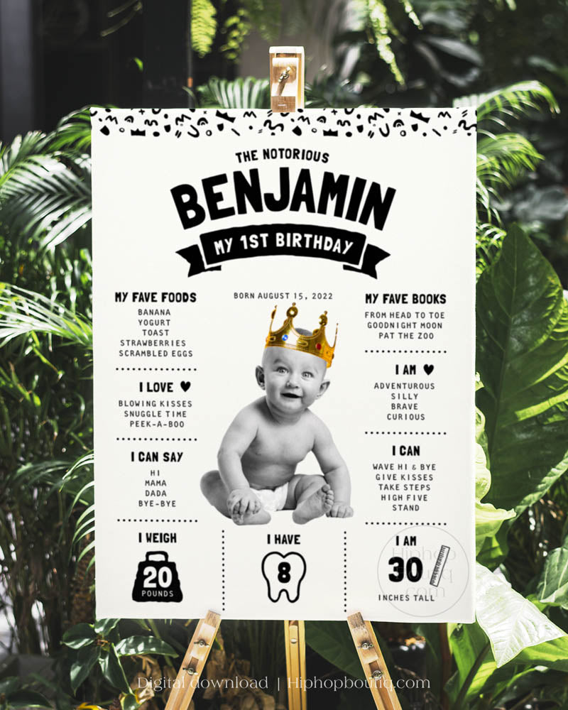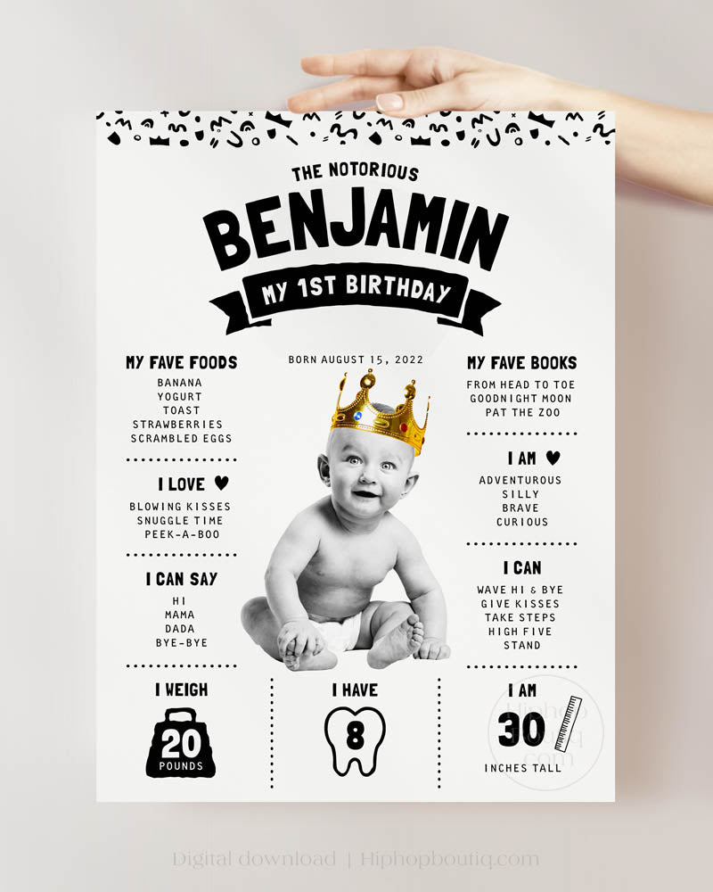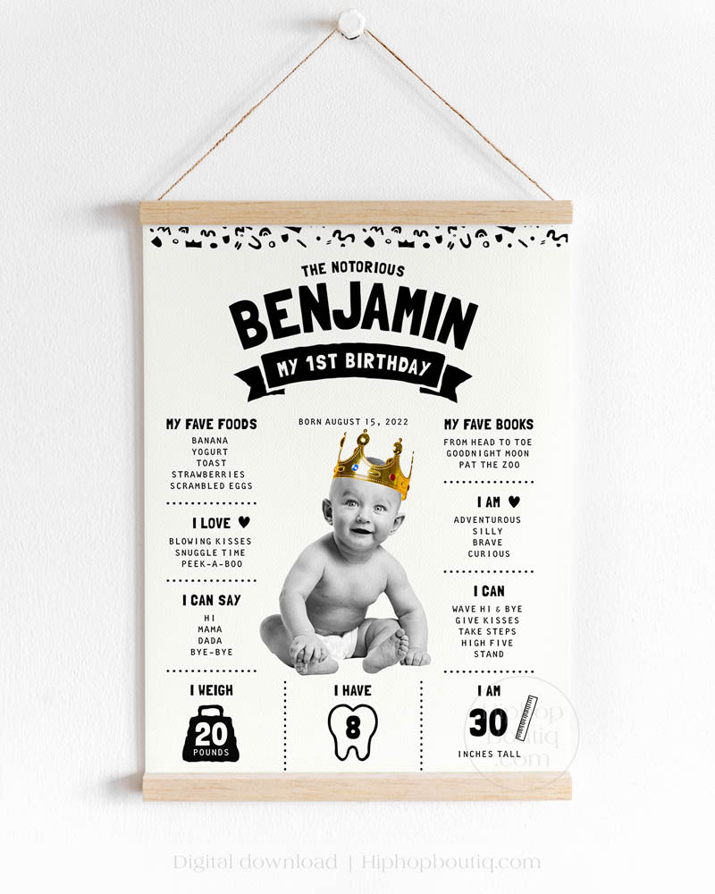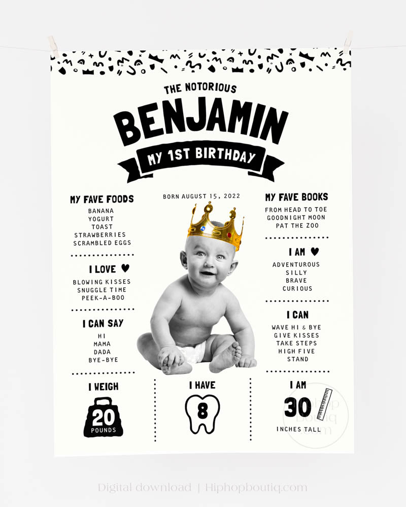 Celebrate your baby turning the Notorious One with this fun first birthday milestone sign – an exclusive homage to your little rap star's big journey! Effortlessly personalize every detail with this editable template, creating one-of-a-kind printable decoration for your hip-hop themed event. Easily add your own text and photo to infuse a truly personalized touch.