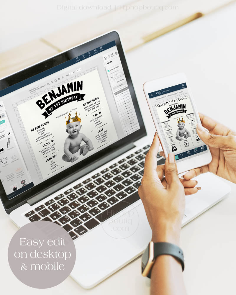 Serving as both a lively decoration and a cherished keepsake, this versatile poster is an ideal addition to any party. As your baby continues to grow, use this engaging first-year milestone chart to create a board filled with precious memories. Crown your baby's 1st birthday celebration with authentic 90s rap vibes, and let the music-themed design turn every moment into an unforgettable memory. Instantly download this template now and watch as your baby's journey unfolds in this unique keepsake!