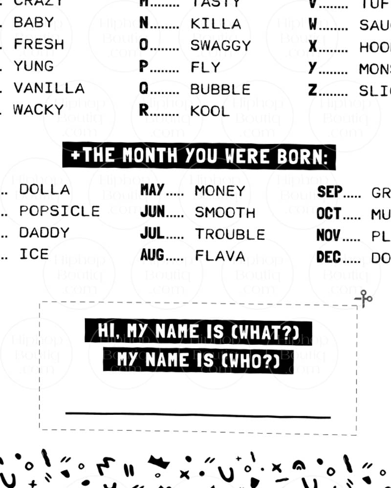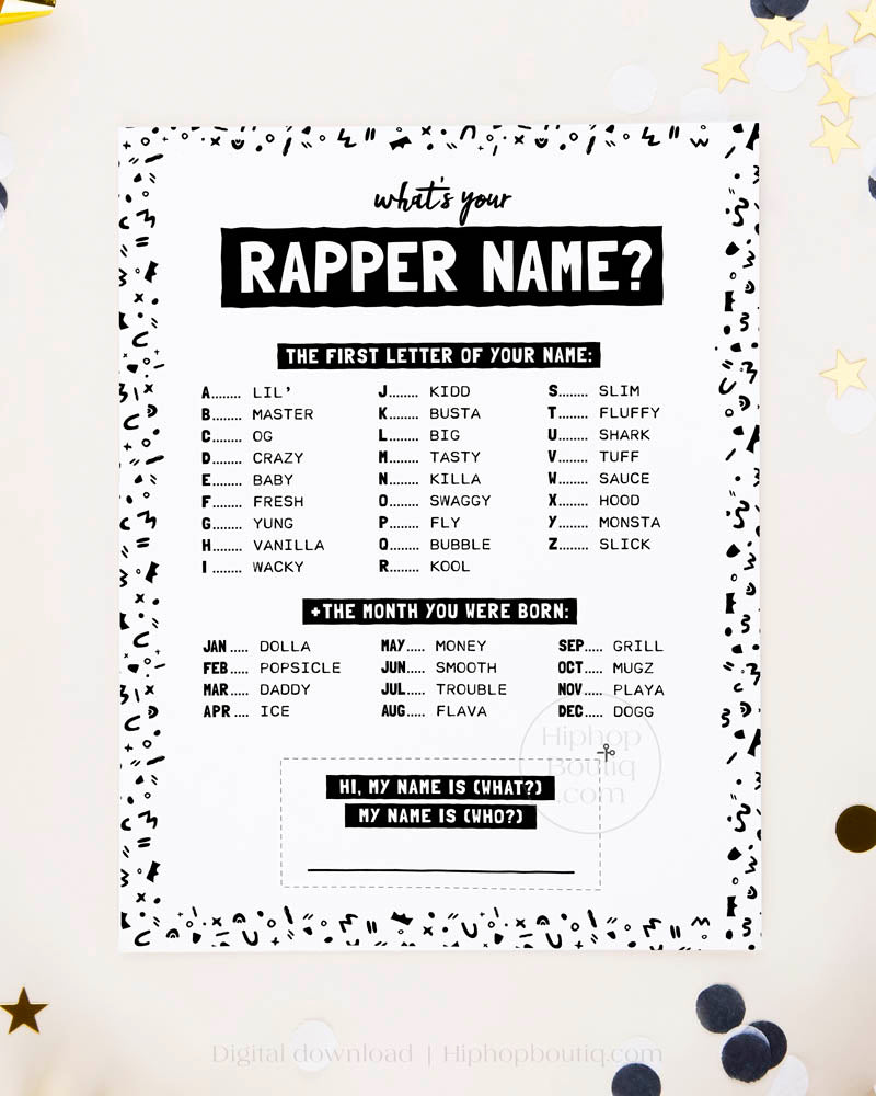 Get ready to unveil your true hip-hop identity with the 'What's Your Rapper Name?' party game! Whether you're celebrating 'The Big One' or throwing a 'Two Legit to Quit' birthday bash, this printable activity is a must-have for all ages. Gather your crew and challenge each other to find out who's got the illest rap name. Suitable for both the little and big homies, from Yung Money to Tasty Playa, this game guarantees endless laughter and unforgettable memories. If you've ever asked yourself, 'What's my rapper name?'— now's your chance to find out!